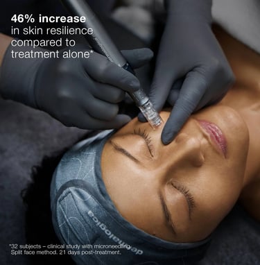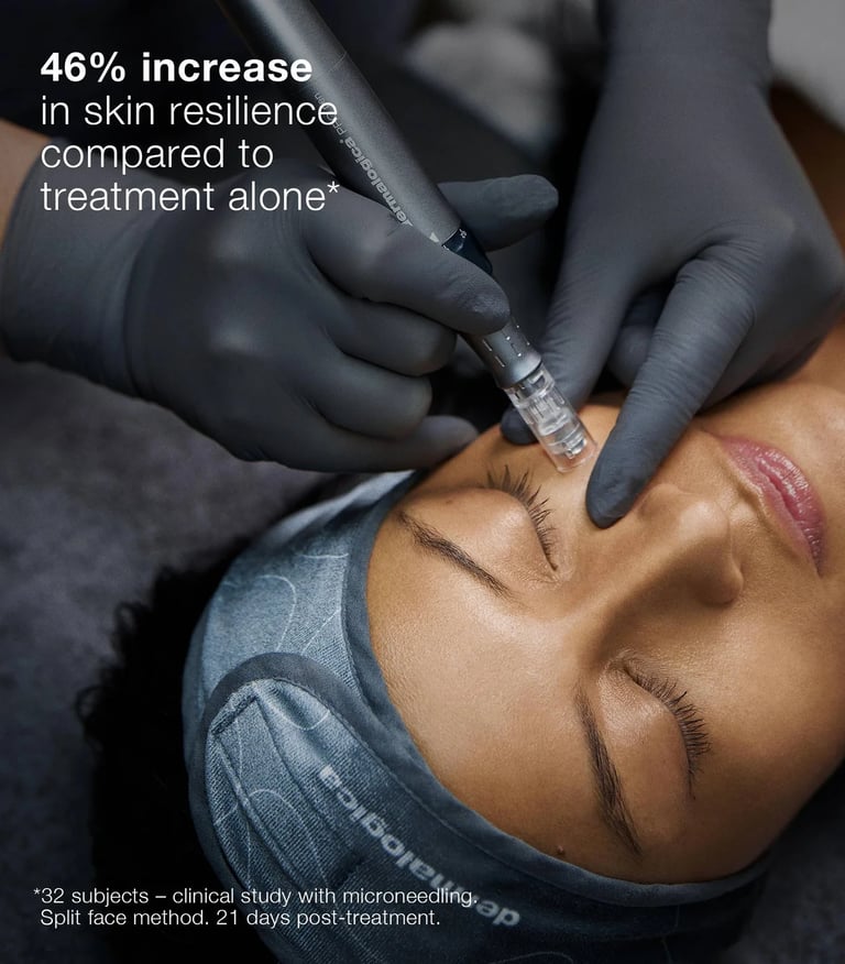 Dermalogica's Pro Microneedling is a minimally invasive procedure that uses fine needles to make miniscule, evenly-spaced micro-injuries to the skin. This triggers the body’s wound healing process, stimulates healthy surrounding tissue to repair the damage, and brings the skin back to its healthiest looking state.